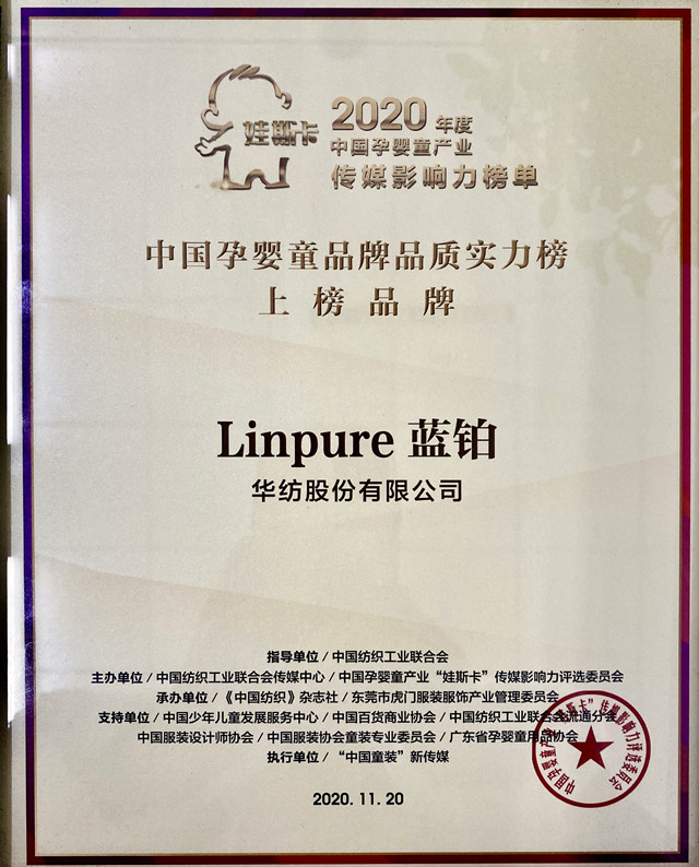 導(dǎo)讀:日前,公司Linpure藍鉑品牌既獲“娃斯卡”2019年度中國孕嬰童品牌暖心實力榜后,再獲中國孕嬰童產(chǎn)業(yè)“娃斯卡”傳媒影響力評選委員會頒發(fā)的2020年度中國孕嬰童品牌品質(zhì)實力大獎。