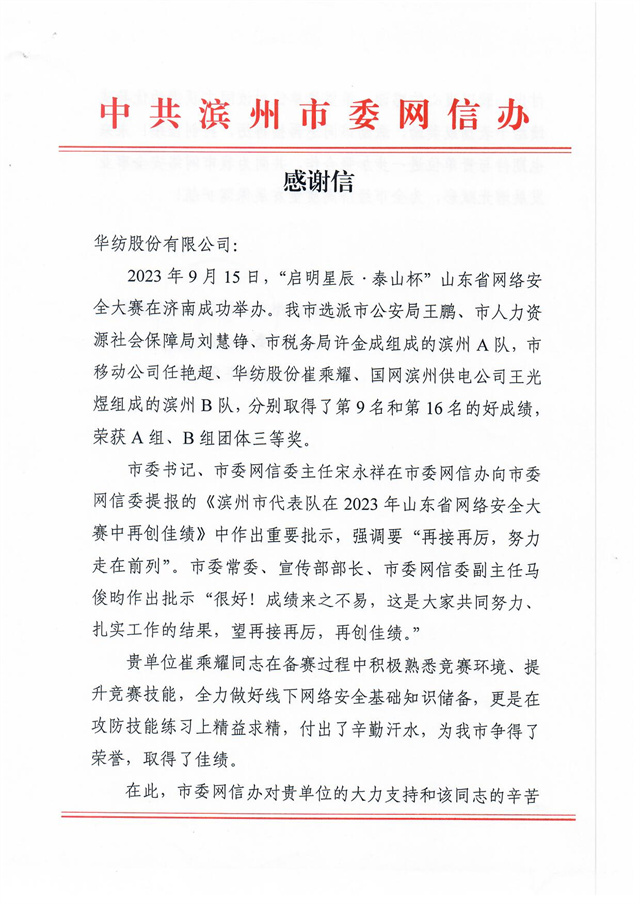 近日,公司收到一封來自濱州市委網(wǎng)信辦的感謝信,信中高度肯定了公司互聯(lián)信息部信息中心信息安全管理員崔乘耀在2023年9月15日“啟明星辰·泰山杯”山東省網(wǎng)絡(luò)安全大賽中所做出的突出貢獻(xiàn),信中指出:“貴單位崔乘耀同志在備賽過程中積極熟悉競賽環(huán)境、提升競賽技能,全力做好線下網(wǎng)絡(luò)安全基礎(chǔ)知識儲備,更是在攻防技能練習(xí)上精益求精,付出了辛勤汗水,為我市爭得了榮譽,取得了佳績。”