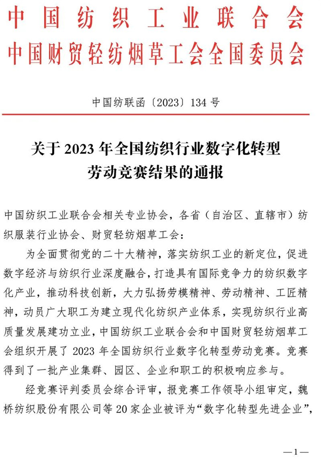 導(dǎo)讀:近日,中國(guó)紡織工業(yè)聯(lián)合會(huì)、中國(guó)財(cái)貿(mào)輕紡煙草工會(huì)全國(guó)委員會(huì)聯(lián)合發(fā)布了《關(guān)于2023年全國(guó)紡織行業(yè)數(shù)字化轉(zhuǎn)型勞動(dòng)競(jìng)賽結(jié)果的通報(bào)》,