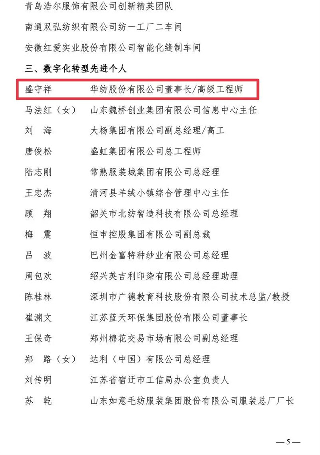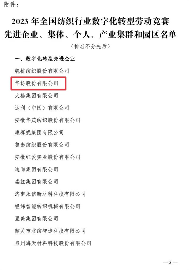 近日,中國(guó)紡織工業(yè)聯(lián)合會(huì)、中國(guó)財(cái)貿(mào)輕紡煙草工會(huì)全國(guó)委員會(huì)聯(lián)合發(fā)布了《關(guān)于2023年全國(guó)紡織行業(yè)數(shù)字化轉(zhuǎn)型勞動(dòng)競(jìng)賽結(jié)果的通報(bào)》,公司憑借2023年在數(shù)字化轉(zhuǎn)型方面的不斷探索與創(chuàng)新被評(píng)為“數(shù)字化轉(zhuǎn)型先進(jìn)企業(yè)”,公司信息互聯(lián)部被評(píng)為“數(shù)字化轉(zhuǎn)型先進(jìn)集體”,公司黨委書(shū)記、董事長(zhǎng)盛守祥先生被評(píng)為“數(shù)字化轉(zhuǎn)型先進(jìn)個(gè)人”。