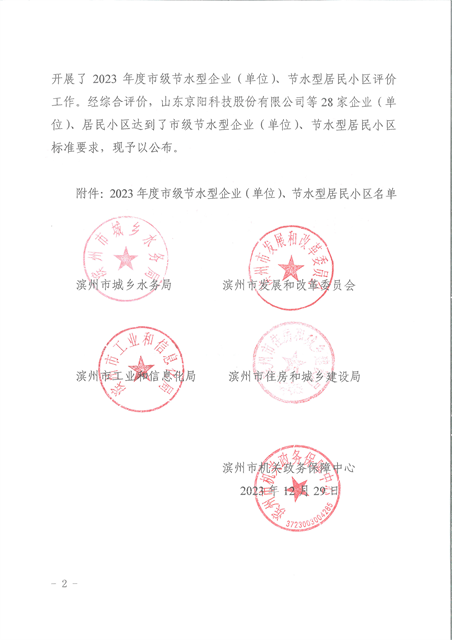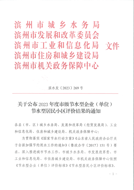 近日,濱州市城鄉(xiāng)水務局、濱州市發(fā)展和改革委員會、濱州市工業(yè)和信息化局、濱州市住房和城鄉(xiāng)建設局、濱州市機關政務保障中心發(fā)布了《關于公布2023年度市級節(jié)水型企業(yè)(單位)、節(jié)水型居民小區(qū)評價結果的通知》,經綜合評價,公司達到市級節(jié)水型企業(yè)(單位 )、節(jié)水型居民小區(qū)標準要求,獲評2023年度濱州市節(jié)水型企業(yè)。