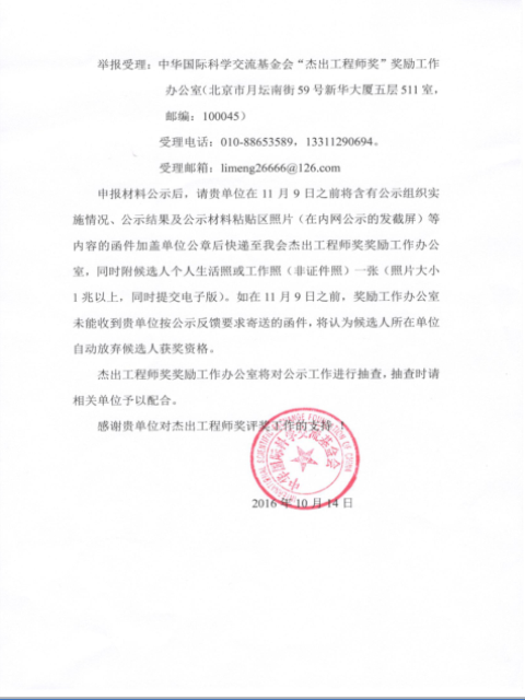 公示內(nèi)容:1、獲獎(jiǎng)候選人杰出工程師獎(jiǎng)的申報(bào)材料和所在單位的推薦意見(jiàn)材料。