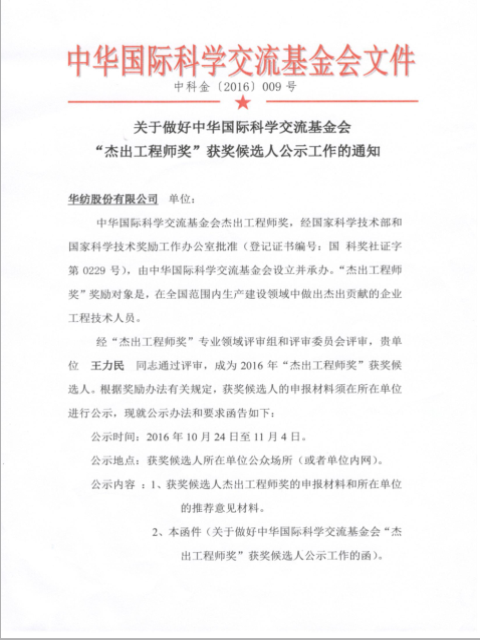 經(jīng)“杰出工程師獎(jiǎng)”專業(yè)領(lǐng)域評(píng)審組和評(píng)審委員會(huì)評(píng)審,華紡股份有限公司王力民同志通過(guò)評(píng)審,成為2016年“杰出工程師獎(jiǎng)”獲獎(jiǎng)候選人。根據(jù)獎(jiǎng)勵(lì)辦法有關(guān)規(guī)定,獲獎(jiǎng)候選人的申報(bào)材料需所在單位進(jìn)行公示。公示如下: