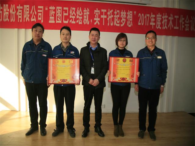 2016年,公司以技術(shù)創(chuàng)新、技術(shù)進(jìn)步為帶動,持續(xù)推進(jìn)精益化生產(chǎn)和標(biāo)準(zhǔn)化操作與管理。技術(shù)委員會以技術(shù)人員的綜合素質(zhì)提升為重點(diǎn),進(jìn)一步強(qiáng)化了技術(shù)人員的選拔、培養(yǎng)與激勵,優(yōu)化了技術(shù)隊(duì)伍的知識結(jié)構(gòu)和專業(yè)技能,公司整體技術(shù)創(chuàng)新能力與水平得到顯著提高。在公司2016年技術(shù)人員打單色樣、大小樣差距實(shí)驗(yàn)、拼色樣、打樣技能等一系列競賽評比工作中,涌現(xiàn)出一批表現(xiàn)突出的技術(shù)人員。為此,公司技術(shù)委員會根據(jù)相關(guān)評比原則及條件,評比出單色樣、打樣技能方面團(tuán)體獎2個(gè),獲獎技術(shù)人員29名??偨?jīng)理閆英山為優(yōu)秀團(tuán)隊(duì)頒發(fā)獎狀,總工程師羅維新為獲獎的專業(yè)技術(shù)人員頒發(fā)榮譽(yù)證書。