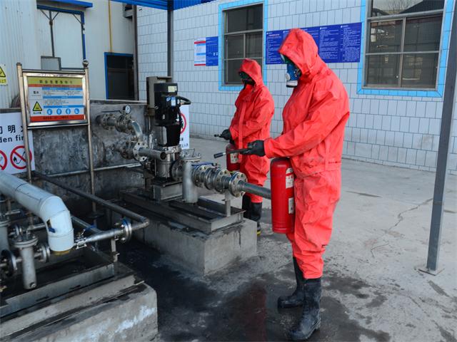 這一幕正是動力公司2月20日進(jìn)行防泄漏演練時的情形。當(dāng)日,動力公司按照公司安保部制定的年度應(yīng)急預(yù)案演練大綱,進(jìn)行了一次氨水泄漏應(yīng)急處理演練。同日,面一車間進(jìn)行了導(dǎo)熱油泄漏現(xiàn)場處置演練。經(jīng)安保部和部門主管測評,兩次演練均符合流程標(biāo)準(zhǔn),達(dá)到了預(yù)期效果。