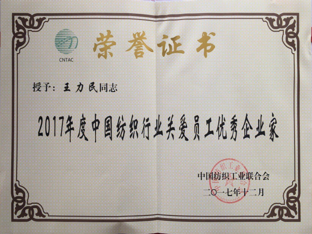 導(dǎo)讀:日前,中國紡織工業(yè)聯(lián)合會(huì)2017年人才工作大會(huì)在濟(jì)南召開,公司榮獲“2017年度中國紡織行業(yè)人才成長(zhǎng)最佳企業(yè)”稱號(hào);王力民榮獲“2017年度中國紡織行業(yè)關(guān)愛員工優(yōu)秀企業(yè)家”稱號(hào)。